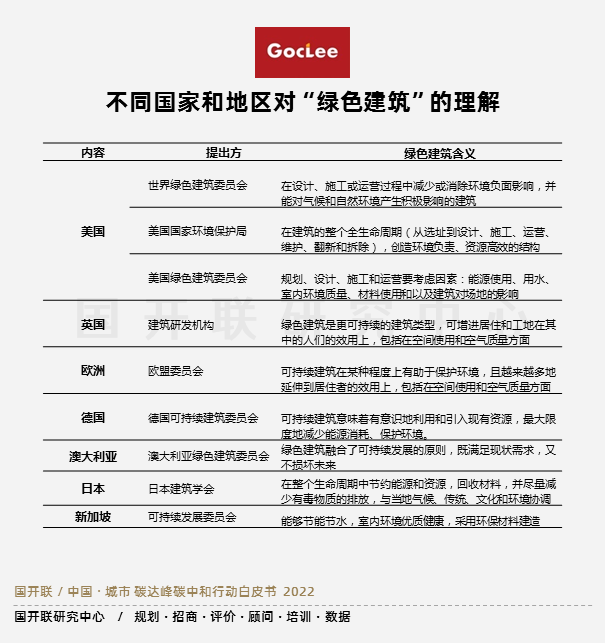 傳統(tǒng)“綠色建筑”往往只停留在選擇環(huán)保建筑材料上,但實際意義上的“綠色建筑”指的是整個建筑全生命周期,即從建材生產(chǎn)、建筑施工、運營直到最終拆除及廢料回收的完整產(chǎn)業(yè)鏈。國開聯(lián)研究中心整理發(fā)現(xiàn),不同國家和地區(qū),由于歷史、文化、傳統(tǒng)、氣候條件、建筑類型和社會條件不同,對綠色建筑的態(tài)度和理解定義不同。