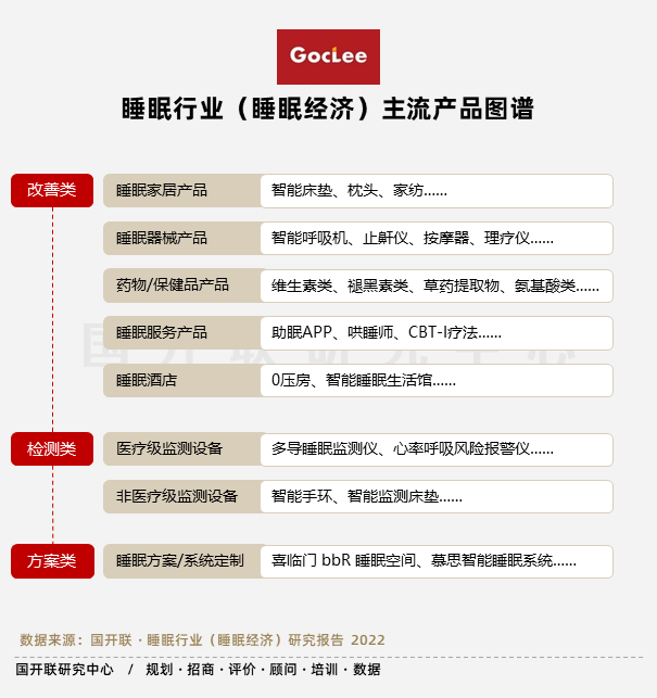 從睡眠行業(yè)產(chǎn)品細(xì)分來(lái)看,主要分成改善睡眠產(chǎn)品、監(jiān)測(cè)睡眠產(chǎn)品以及助眠方案/系統(tǒng)定制。第一,改善類睡眠產(chǎn)品主要分為五種,一是睡眠家居產(chǎn)品,包括智能床墊、枕頭、家紡等;二是睡眠器械產(chǎn)品,包括智能呼吸機(jī)、止鼾儀、按摩器、理療儀等;三是藥物/保健產(chǎn)品,包括維生素類、褪黑素類、草藥提取物、氨基酸類助眠保健品等;四是睡眠服務(wù)產(chǎn)品,包括助眠APP、哄睡師、CBT-I療法等;五是睡眠酒店類,如0壓房、智能睡眠生活館等。第二,監(jiān)測(cè)睡眠產(chǎn)品主要分為醫(yī)療級(jí)監(jiān)測(cè)設(shè)備,包括多導(dǎo)睡眠監(jiān)測(cè)儀、心率呼吸風(fēng)險(xiǎn)報(bào)警儀、睡眠呼吸初篩儀等,以及非醫(yī)療級(jí)監(jiān)測(cè)設(shè)備,如智能手環(huán)、智能檢測(cè)床墊等。第三,睡眠方案系統(tǒng)打造,如喜臨門(mén)bbR睡眠空間、慕思智能睡眠系統(tǒng)等。