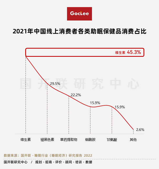 據(jù)國(guó)開(kāi)聯(lián)《睡眠行業(yè)研究報(bào)告》數(shù)據(jù)顯示,2021年中國(guó)45.3%購(gòu)買了維生素類助眠保健品,29.5%網(wǎng)民購(gòu)買了褪黑素助眠保健品,其次為草藥提取物和氨基酸類成分。從助眠成分來(lái)看,主要為中藥材植物原料(酸棗仁、靈芝、五味子、茯苓),氨基酸類(甘氨酸、精氨酸、絲氨酸、色氨酸等),新食品原料(茶葉茶氨酸、GABA),激素類(褪黑素)以及牛奶蛋白(乳清蛋白、乳鐵蛋白、酪蛋白水解肽)。