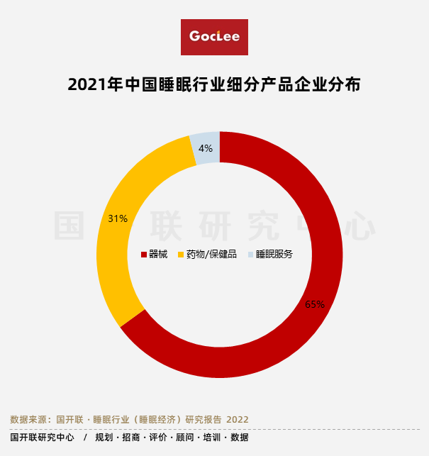 據(jù)國(guó)開(kāi)聯(lián)研究中心的不完全統(tǒng)計(jì),中國(guó)睡眠產(chǎn)業(yè)企業(yè)數(shù)量為2000家。其中器械占比最高為65%,其次為藥物/保健品為31%,睡眠服務(wù)為4%。