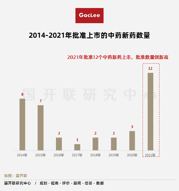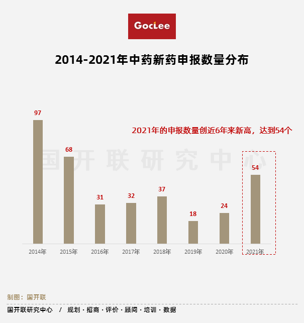 據(jù)國(guó)開聯(lián)研究中心發(fā)布的《中醫(yī)藥(綜合)行業(yè)研究報(bào)告2022》數(shù)據(jù)顯示,受疫情及國(guó)家相關(guān)政策推動(dòng)影響,中藥新藥申報(bào)數(shù)量從2020年開始開始回升,2021年的申報(bào)數(shù)量創(chuàng)下近6年新高,達(dá)到54個(gè)。2021年共有12個(gè)中藥新藥獲批上市,批準(zhǔn)數(shù)量創(chuàng)新高,比2017-2020年獲利之和還多。中藥審批審評(píng)制度改革已初顯成效,中藥創(chuàng)新研發(fā)正被逐漸崛起,成為新投資者重點(diǎn)關(guān)注領(lǐng)域。