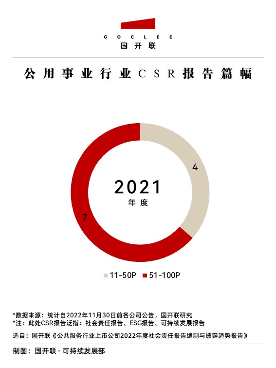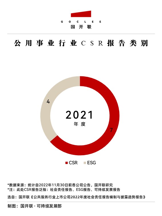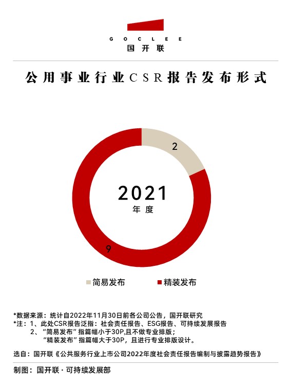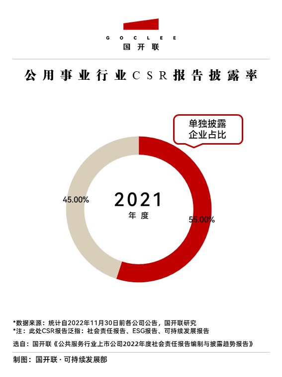 根據(jù)國開聯(lián)發(fā)布的《公共服務(wù)行業(yè)A股上市公司2022年度社會責(zé)任報告編制與披露趨勢》報告數(shù)據(jù)顯示,2021年度公用事業(yè)版塊A股上市中獨立披露社會責(zé)任報告(CSR)和ESG報告的企業(yè)數(shù)達11家,占該版塊全部上市公司的55%。