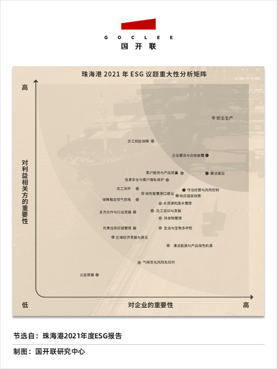 2021年度,珠海港獨(dú)立披露了環(huán)境、社會(huì)及管治報(bào)告(ESG),內(nèi)容體系完善,設(shè)計(jì)排版精美,尤其在可持續(xù)發(fā)展議題體系的搭建上,基于航運(yùn)港口行業(yè)生態(tài)做出了相對(duì)系統(tǒng)性的安排。