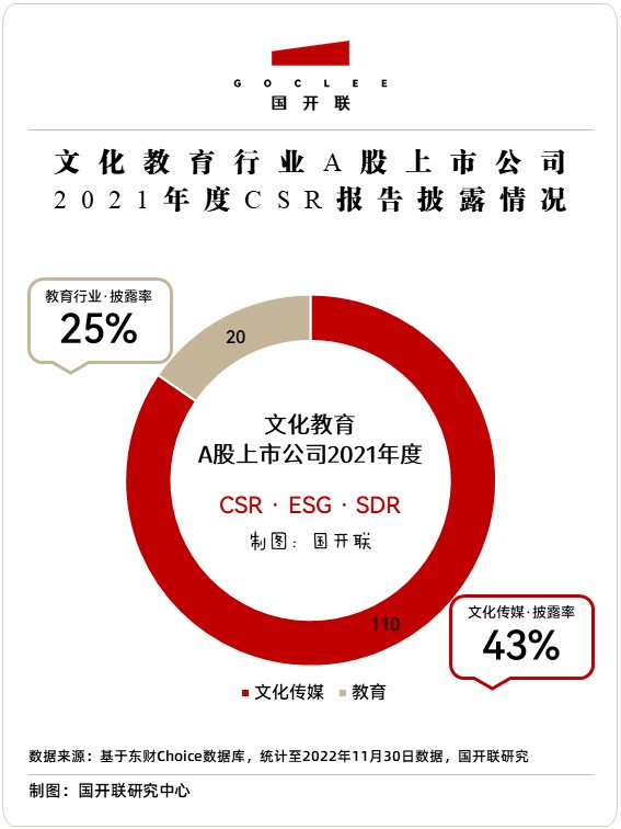 國開聯(lián)《報(bào)告》數(shù)據(jù)顯示,截至2022年11月30日,我國A股市場共有文化傳媒行業(yè)上市公司110家,教育行業(yè)上市公司20家。其中,2021年度有獨(dú)立披露社會(huì)責(zé)任報(bào)告(或ESG報(bào)告、可持續(xù)發(fā)展報(bào)告)的文化傳媒類企業(yè)47家,教育類企業(yè)5家。