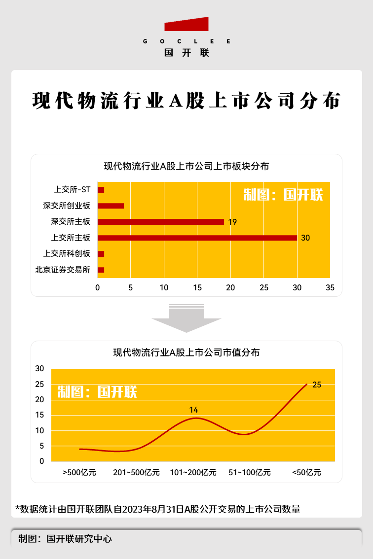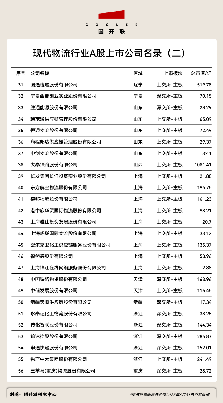 根據(jù)國(guó)開聯(lián)研究中心的統(tǒng)計(jì)數(shù)據(jù),截至2023年8月31日,我國(guó)A股現(xiàn)代物流業(yè)上市公司,共計(jì)56家,廣泛分布于上交所、深交所和北交所。