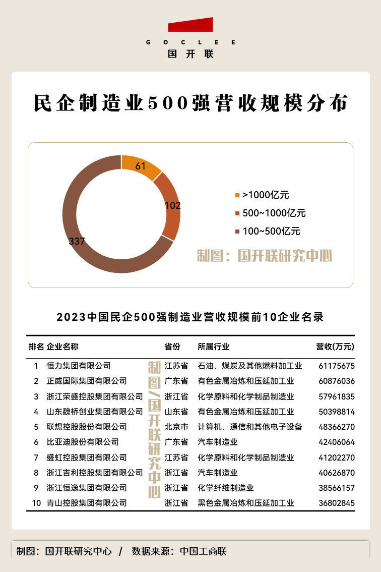 根據(jù)中國工商聯(lián)發(fā)布的《2023中國制造業(yè)民營企業(yè)500強(qiáng)榜單》,年營收規(guī)模達(dá)145億元是入榜門檻。根據(jù)國開聯(lián)統(tǒng)計數(shù)據(jù)顯示,在整個榜單中,年營收規(guī)模超過1000億元的企業(yè),達(dá)61家;年營收規(guī)模介于500億元至1000億元之間的企業(yè),達(dá)102家;年營收規(guī)模介于100億元至500億元之間的企業(yè),達(dá)337家。