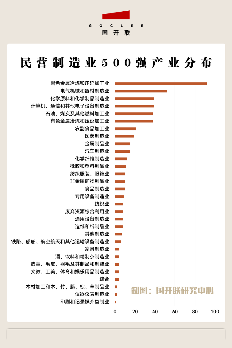 根據(jù)國開聯(lián)統(tǒng)計數(shù)據(jù)顯示,《中國制造業(yè)民營企業(yè)500強(qiáng)榜單》對應(yīng)企業(yè)共涉及產(chǎn)業(yè)板塊達(dá)30個。
