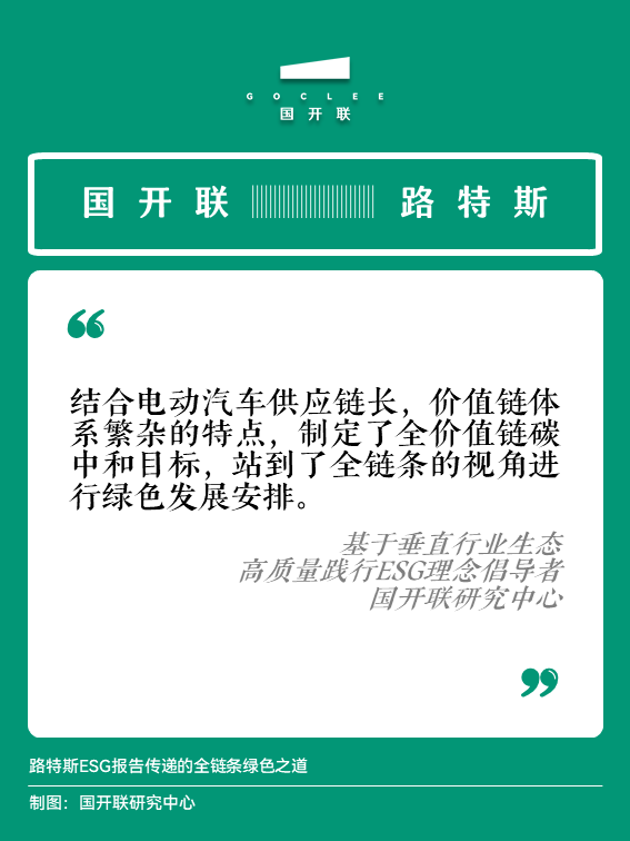 國開聯(lián)可持續(xù)發(fā)展團(tuán)隊(duì)研究發(fā)現(xiàn),路特斯披露的ESG報(bào)告除了介紹路特斯科技ESG戰(zhàn)略、梳理2022年在履行環(huán)境責(zé)任、創(chuàng)造社會(huì)價(jià)值及提升公司治理方面所取得的成就等常規(guī)信息外,在路特斯ESG報(bào)告中,所傳遞出來的是路特斯針對企業(yè)所處全價(jià)值鏈的綠色發(fā)展所做出的戰(zhàn)略安排。